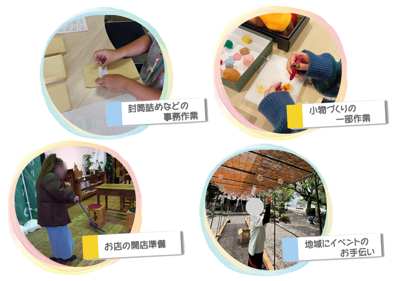 現在、ものづくり作家や福祉事業所、企業、地域団体の方々にもご協力いただき、小物づくりの一部作業やお店の開店準備、封筒詰めなどの社会参加・就労体験の場を提供していただいています。